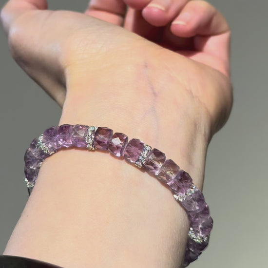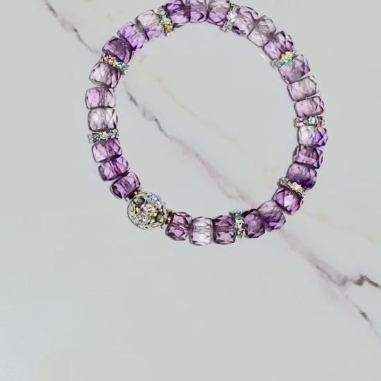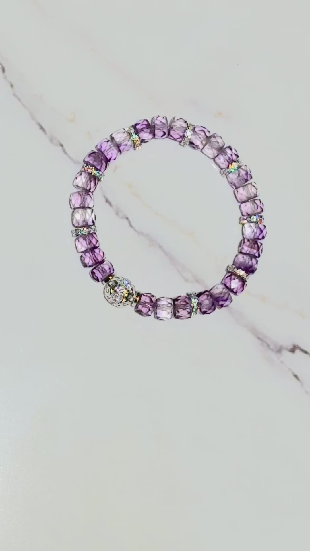 - Faceted round-cut amethyst beads with a soft gradient of purple hues