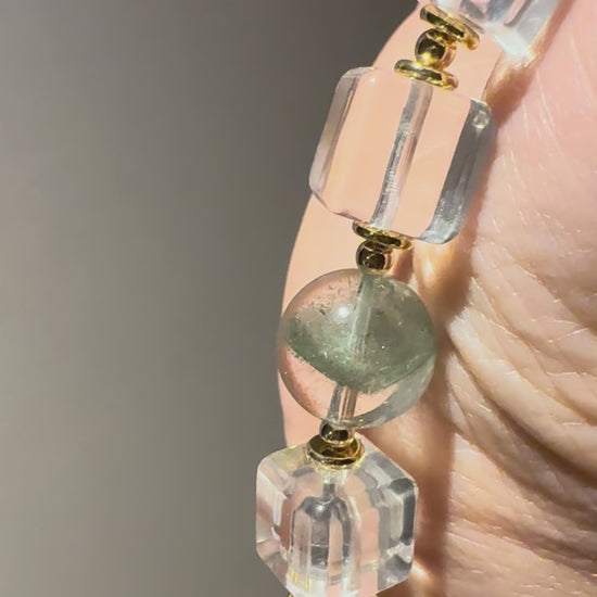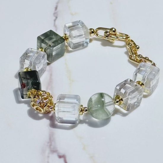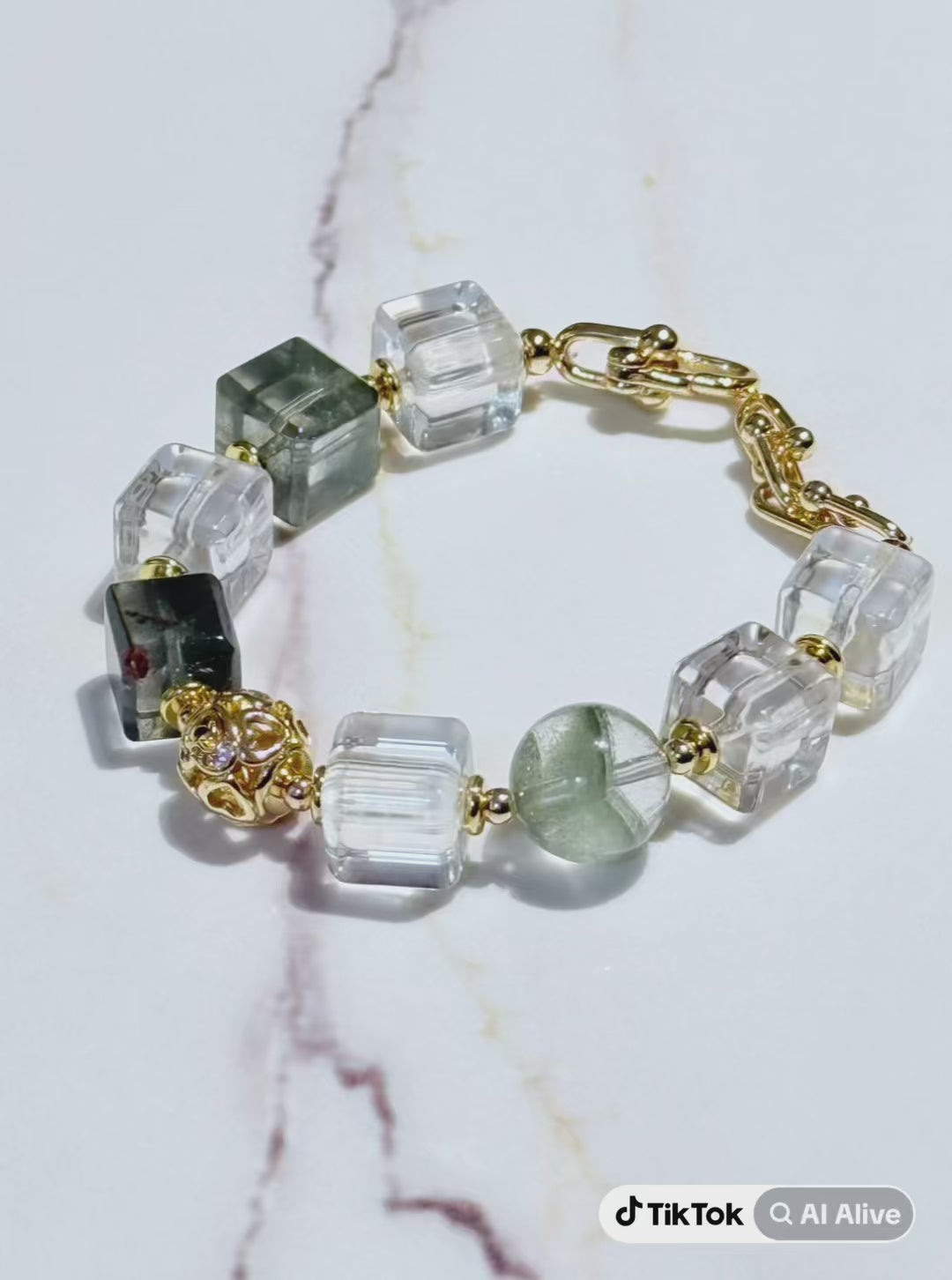 An elegant design featuring Green Phantom Quartz beads and premium double-A grade Clear Quartz, finished with a durable lobster clasp in a golden tone for secure wear.